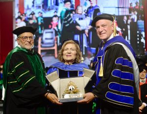 من جهته، ألقى البروفسور فيليب سالم، خطيب حفل التخرج، كلمة استعرض فيها مراحل مسيرته الطويلة التي أوصلته إلى العالمية، مركزًا على أهمية العودة إلى الجذور والإيمان بالوطن والانتماء له. وتقديرًا لعطاءاته، قدّم له الرئيسة المؤسسة هيام صقر والدكتور رياض صقر درعًا تذكاريًا وعباءتين من تصميم وتنفيذ قسم تصميم الأزياء في الجامعة.